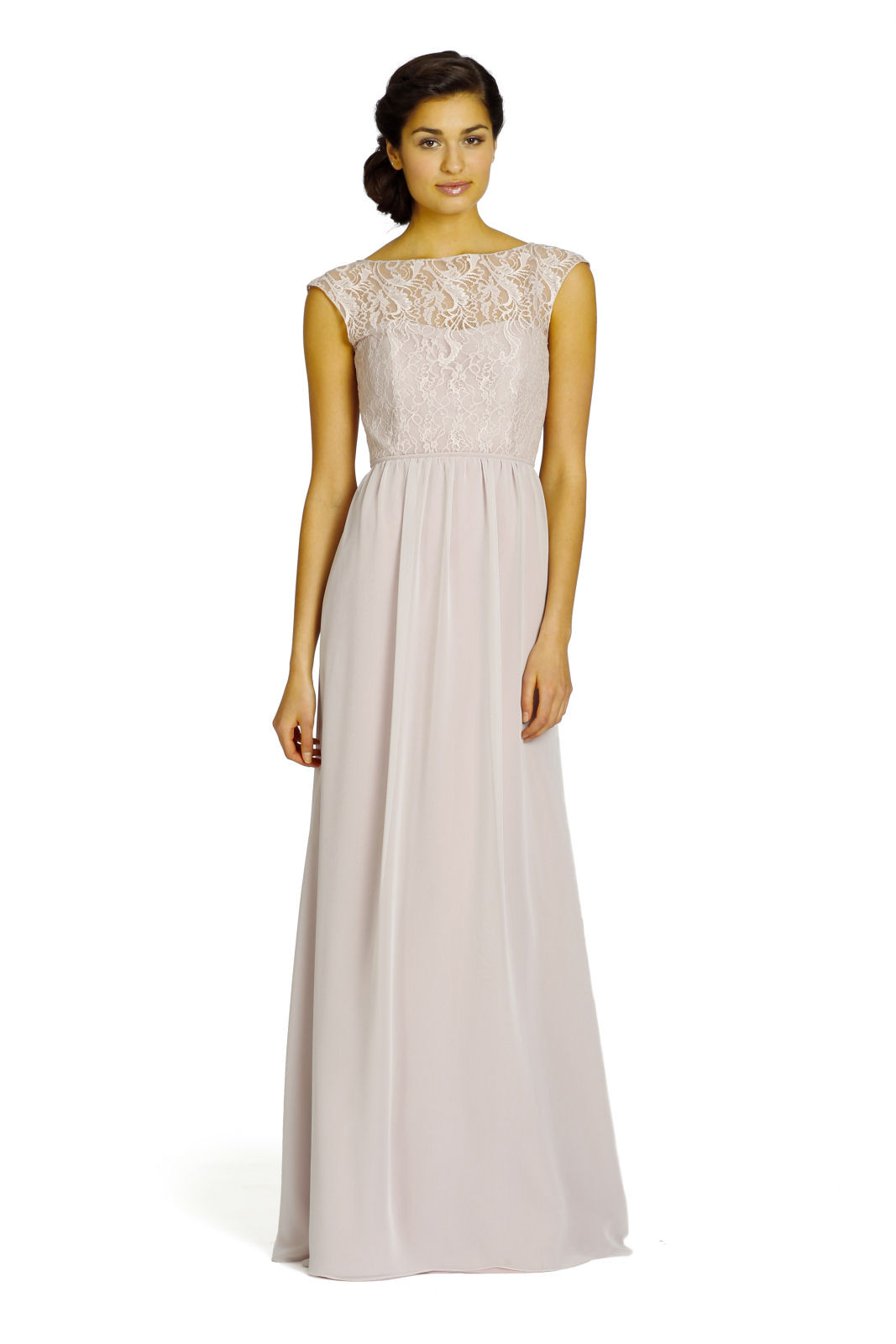 A-line lustrous chiffon gown with Chantilly lace bodice, bateau neckline and wide straps.