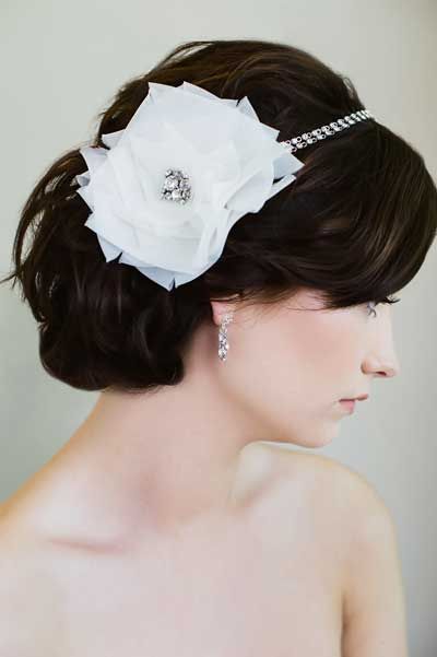 Ivory fabric flower headpiece with rhinestone chain headband and brooch.